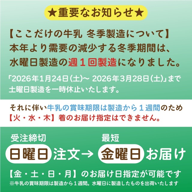 ★重要★【ここだけの牛乳 冬季製造についてお知らせ】【火・水・木】着不可