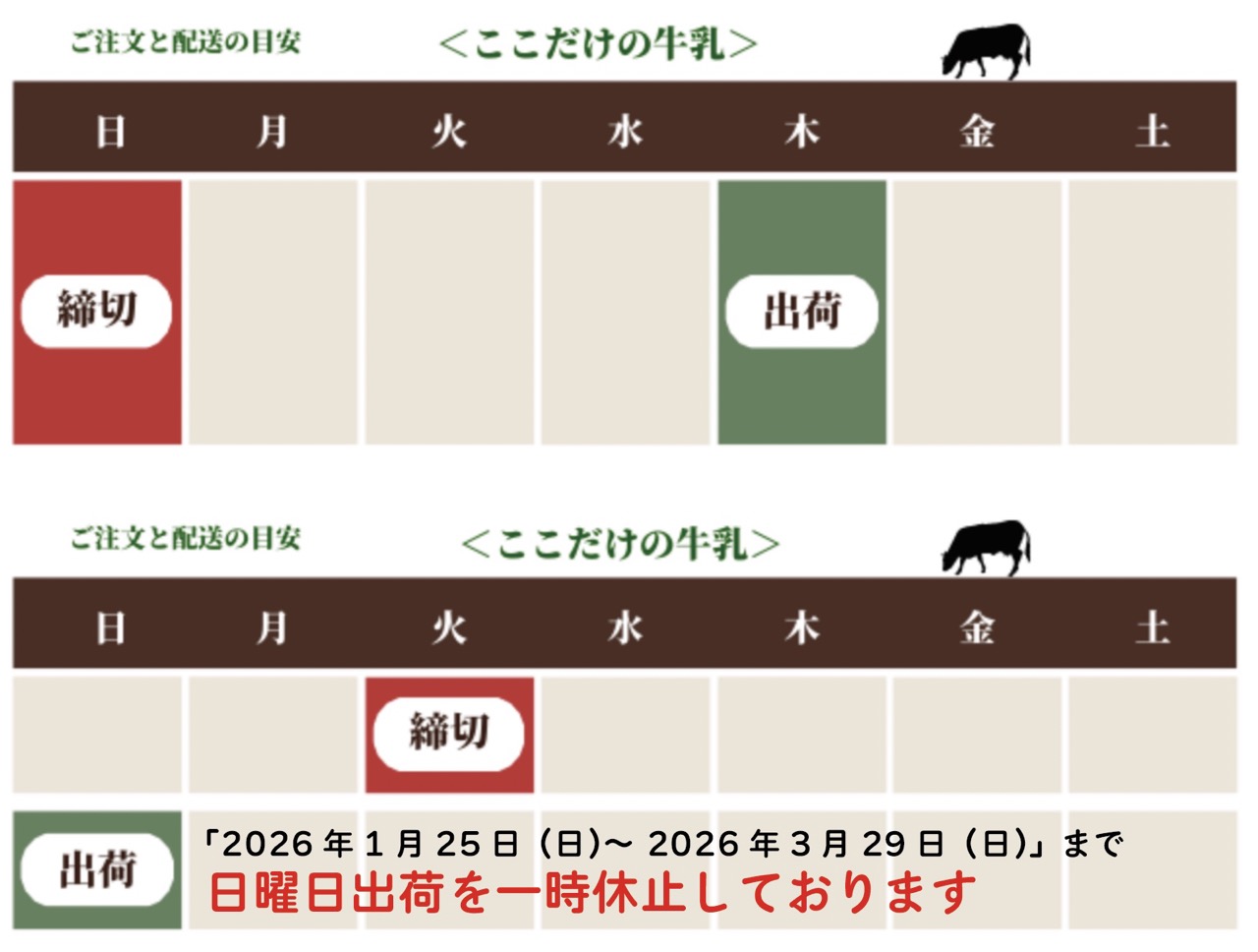 「2026年1月25日(日)〜 2026年3月29日(日)」まで日曜日出荷を一時休止。