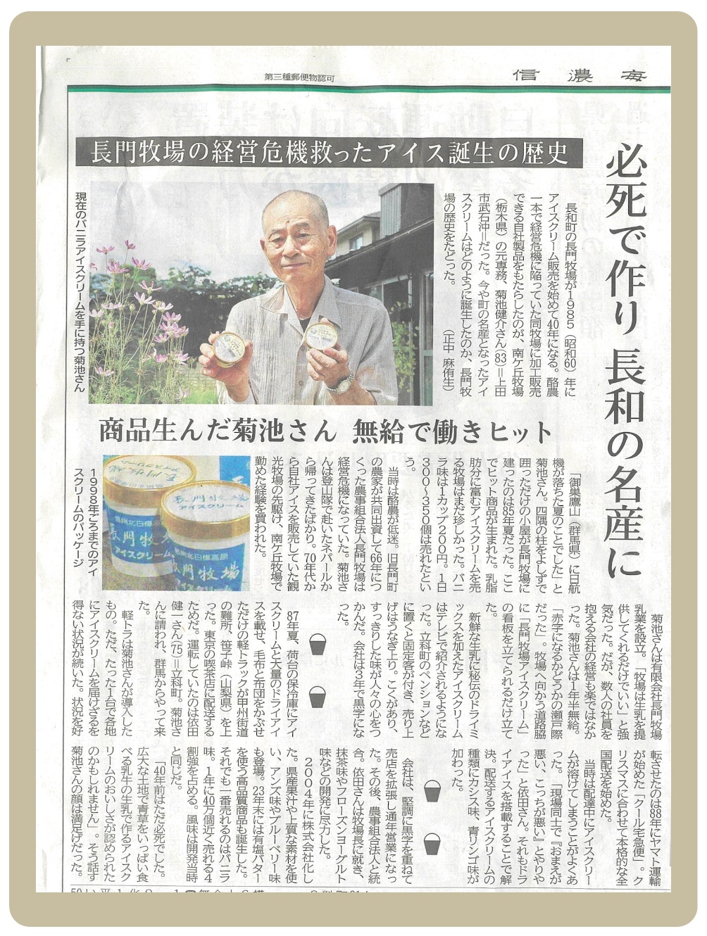 当時アイスクリームの開発に携わった菊池健介さんのインタビュー記事が信濃毎日新聞に掲載されました
