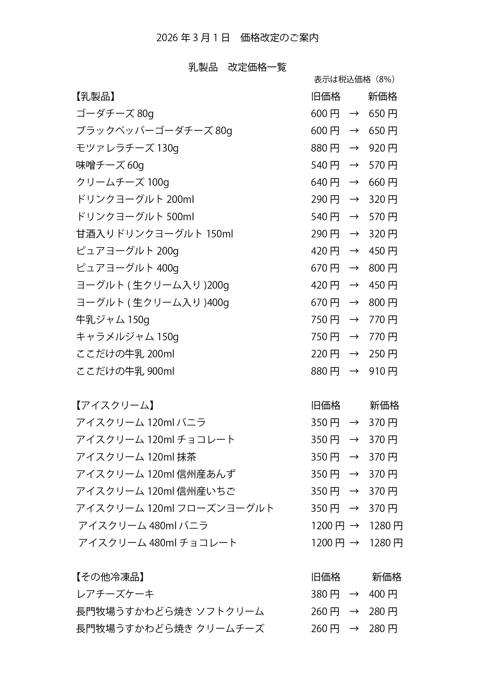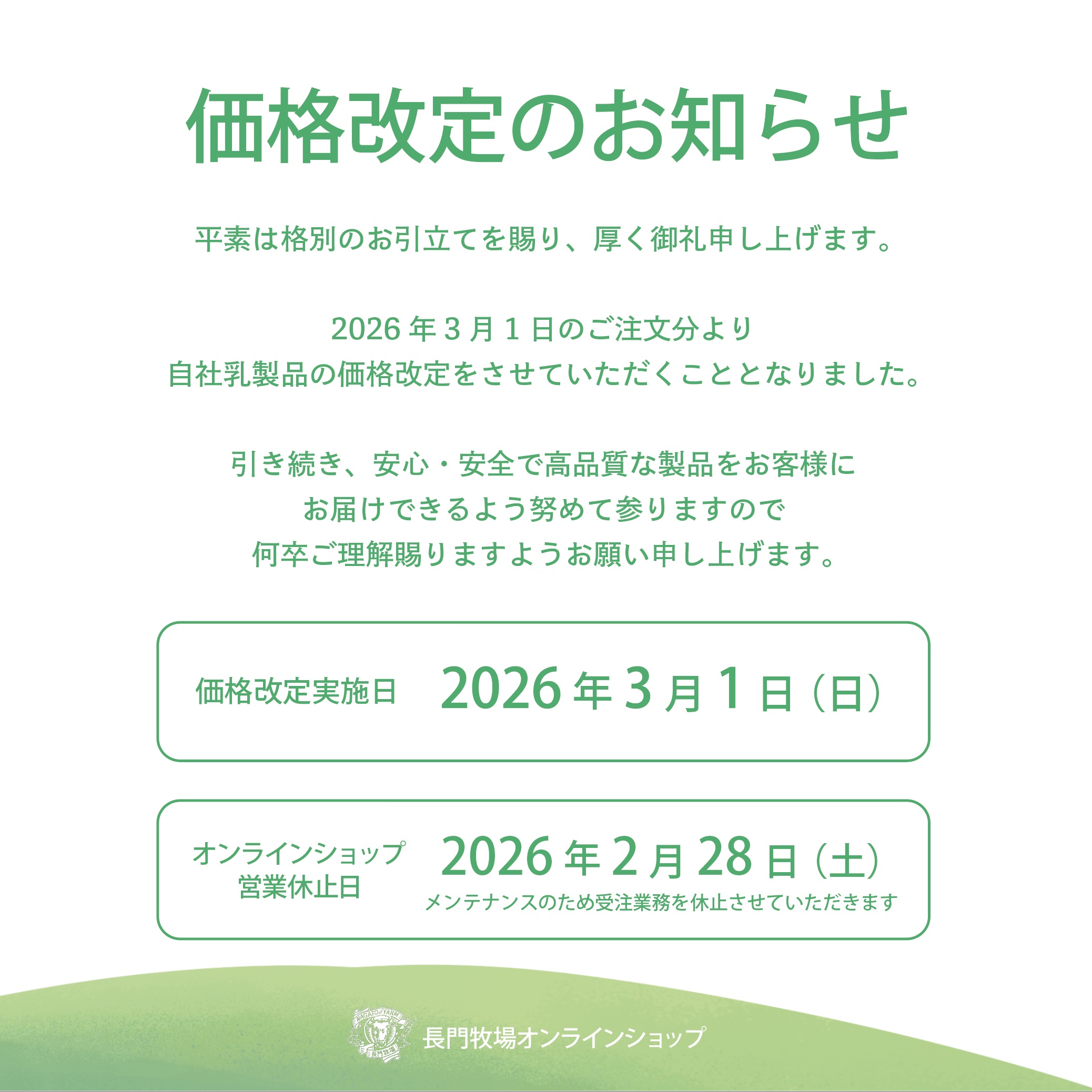 自社乳製品および配送料金の価格改定をさせていただくこととなりました。